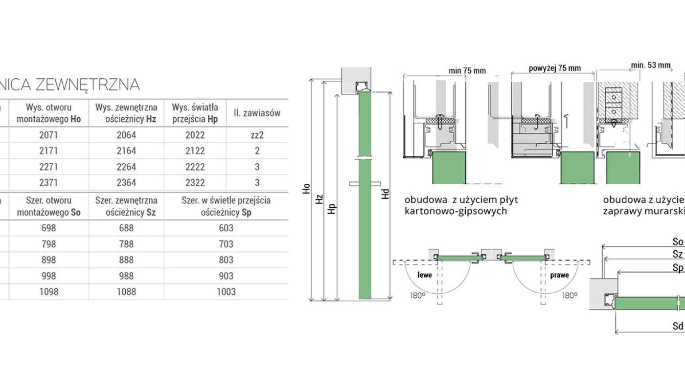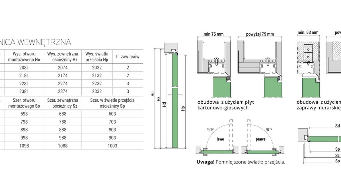 - skrzydło wewnętrzne – przylgowe, otwierane do wewnątrz (wys. 2032 mm)
