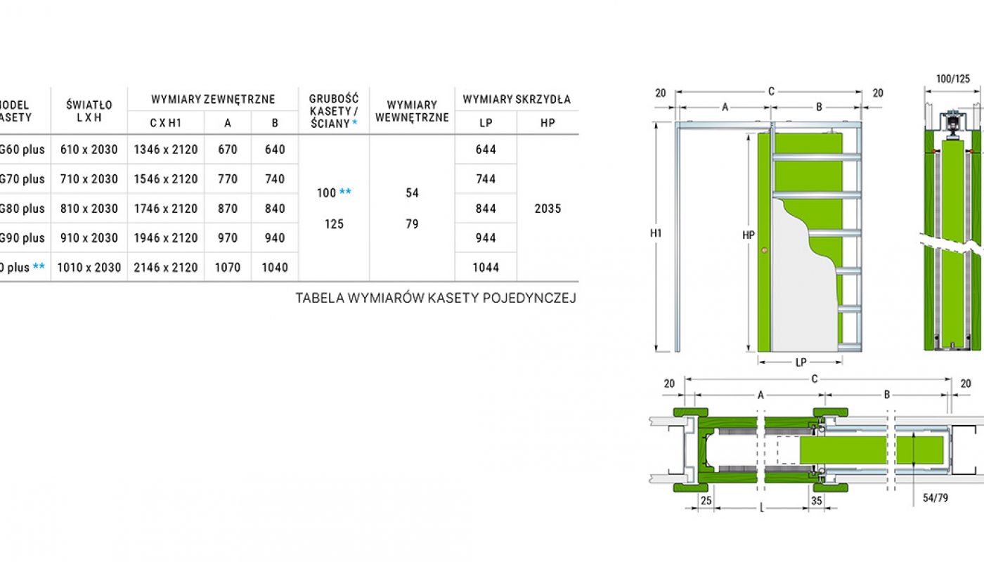 Konstrukcję systemu zbudowanego z metalowych kształtowników stanowi kaseta, w którą chowa się skrzydło podczas otwierania drzwi.