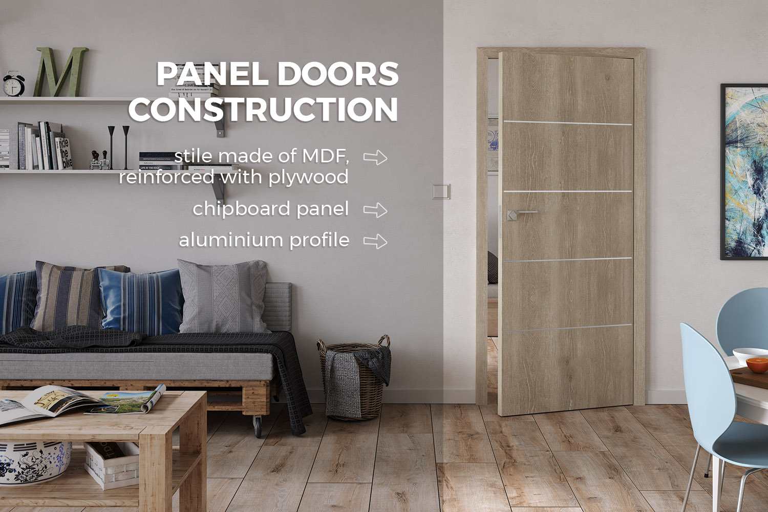 Stosowane wewnątrz konstrukcji płytowej wypełnienie pełni rolę usztywniającą i dźwiękochłonną. Zewnętrzne płyty są wykańczane folią, okleiną lub lakierowane. Ich powierzchnia może być całkowicie gładka lub ozdobiona tłoczeniami. W roli elementów dekoracyjnych pojawiają się m.in.: przeszklenia (np. drzwi Tetyda, modele 1-4) i aplikacje aluminiowe (np. drzwi Discovery).